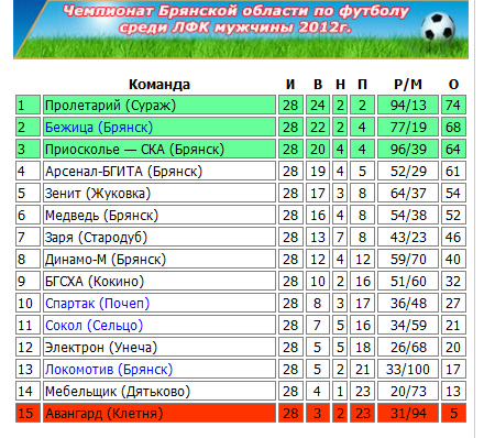 Завершился Чемпионат Брянской области по футболу среди ЛФК мужчин. Чемпионом в 8-й раз стала команда «Пролетарий» (Сураж), 2 место заняла команда «Бежица» (Брянск), а бронзовыми призерами впервые в своей истории стали игроки команды «Приосколье-СКА» (Брянск).