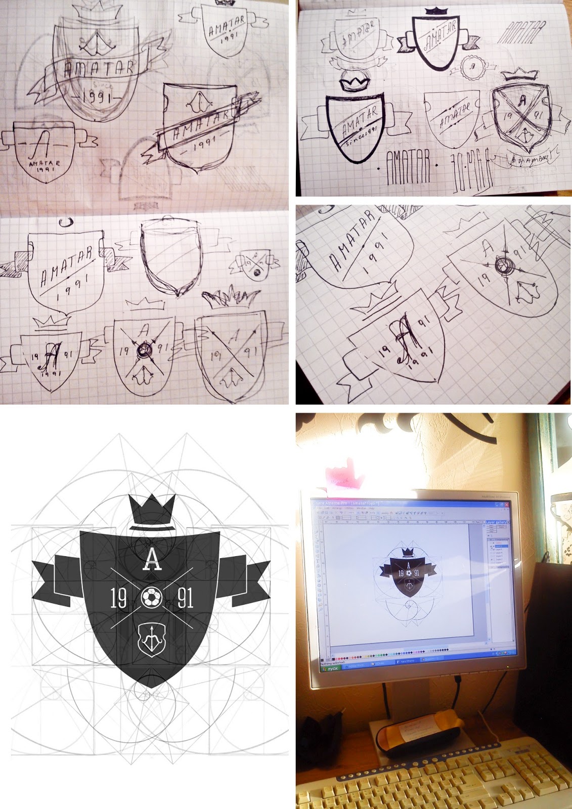 3. Выбранные эскизы отрисовываются на компьютере в векторе. Выбирается наиболее удачный вариант и дорабатывается. Сейчас уже происходит поиск идеальной композиции - и здесь на помощь приходит универсально-гениальный принцип золотого сечения.